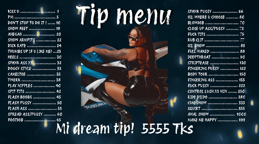 Zezadu, Ahegao, Kuřba, Masturbace, Nahoře bez, Podpatky, Twerk, Erotický tanec, Olejová show, Dildo nebo vibrátor, Striptýz, Footfetish, Sexuální hračky